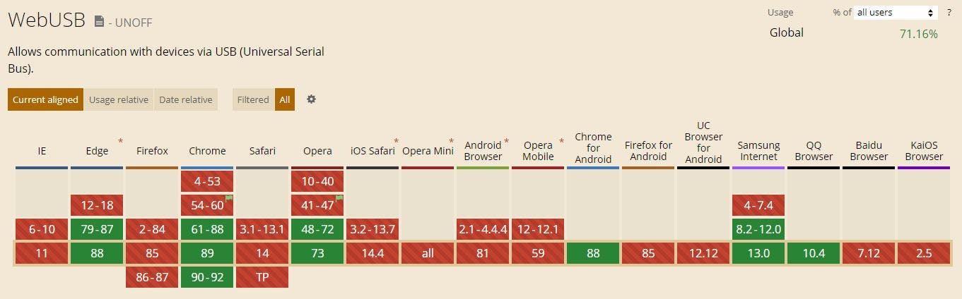WebUSB is nog geen officiële standaard van het World Wide Web Consortium (W3C). Ontwikkelaars van Google hebben WebUSB in 2016 voorgesteld aan de Web Incubator Community Group (WICG) van het W3C, een platform voor experimentele webtechnologieën. Sinds Chrome 61 is WebUSB-ondersteuning ook in de webbrowser van Google ingebouwd. Andere webbrowsers zijn voorlopig nog niet overstag gegaan, zoals je bij de website Can I use kunt zien.