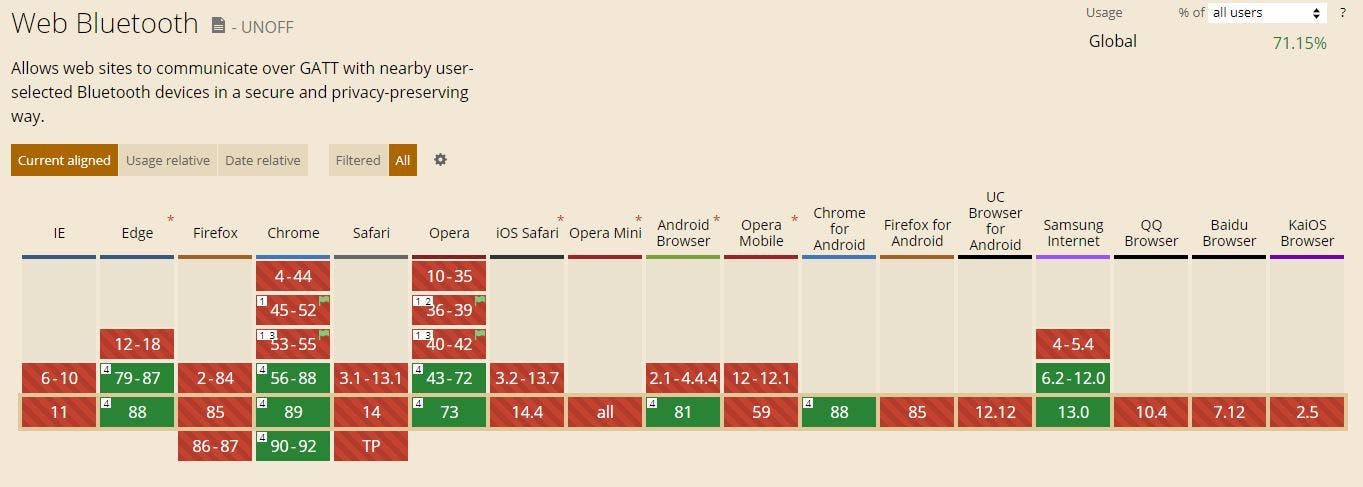 Een vergelijkbare standaard, eveneens door Google uitgebracht, is Web Bluetooth. Die laat webapps toe om met apparaten in de buurt te communiceren via bluetooth. En net zoals bij WebUSB wordt ook hier gewoon gebruikgemaakt van bestaande afspraken, in dit geval van bluetooth low-energy (BLE).