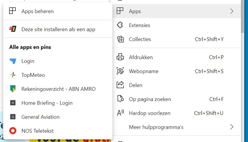 Je kunt de app ook toevoegen aan andere locaties, bijvoorbeeld als tegel aan het Startmenu. Klik met de rechtermuisknop op de app en kies Aan Start vastmaken. Om de app vast te pinnen aan de taakbalk, klik je erop met de rechtermuisknop en kies je Meer, Aan de taakbalk vastmaken. Je vindt de apps ook in het menu van Edge. Klik weer op het knopje met de drie puntjes (...) en kies Apps. Onder Alle apps en pins vind je een overzicht.
