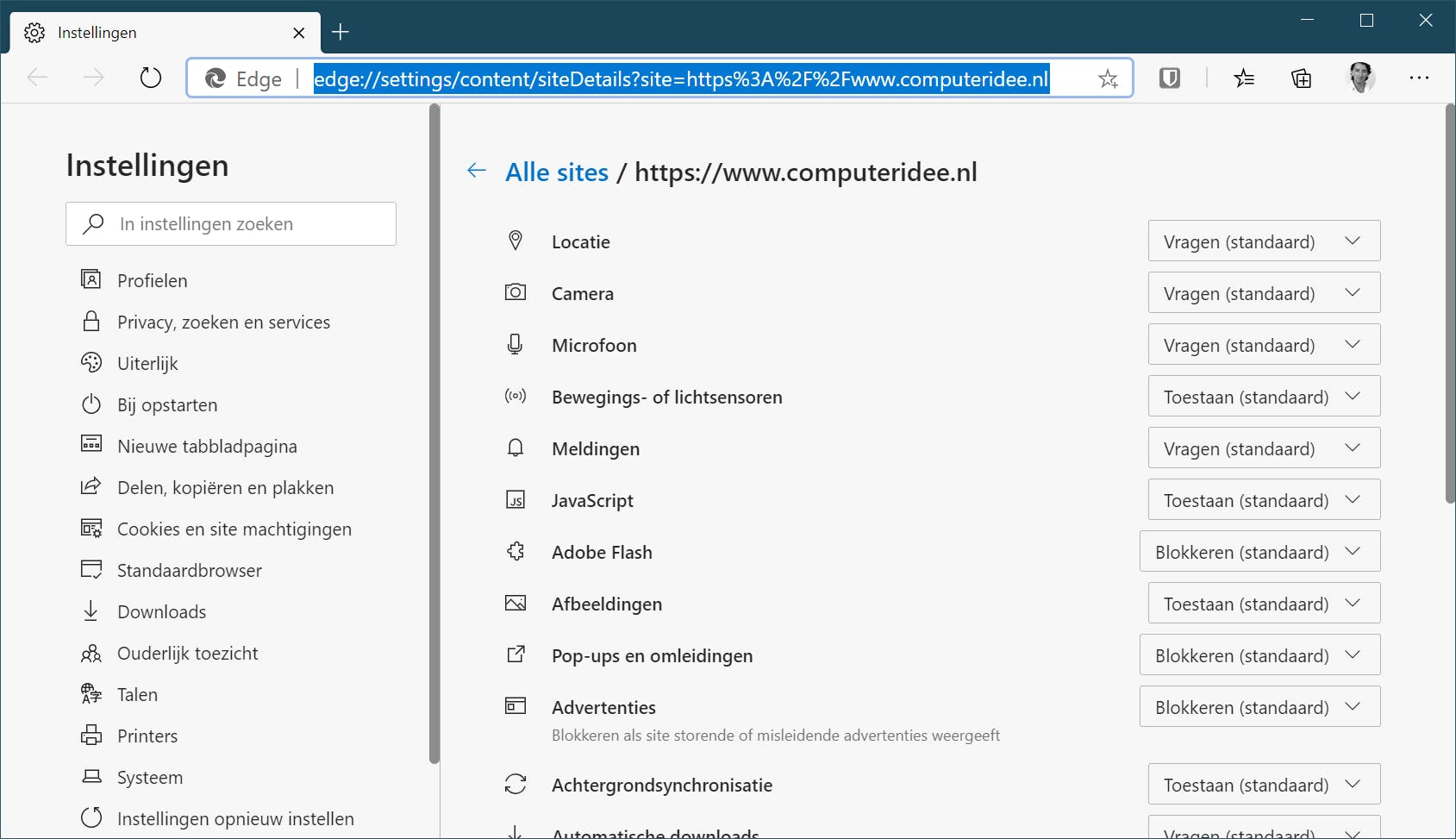 Standaard vraagt Edge bij elke actie of deze is toegestaan, maar je kunt de actie ook op voorhand al verbieden of juist toestaan. Heb je machtigingen aangepast, maar wil je weer terug naar de fabriekswaarden, dan kies je voor Machtigingen opnieuw instellen.