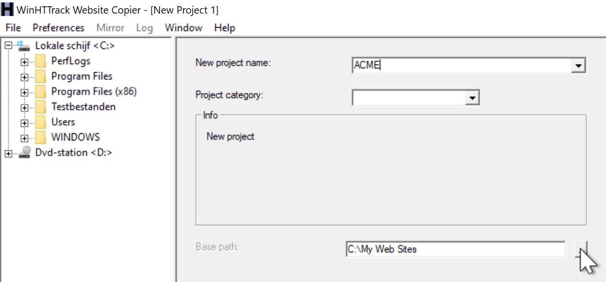 Start WinHTTrack, inmiddels na installatie te vinden in het menu Start. Klik in het hoofdvenster van WinHTTRack op Volgende. Tik achter New project name (WinHTTrack is een mix van Nederlands en Engels) een naam voor het downloadproject in, in dit voorbeeld dus ACME. Standaard worden alle gedownloade sites bewaard in de map c:\My Web Sites. achter Base Path kun je hier een andere map opgeven, zoals een share op de NAS.