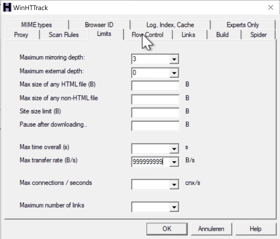 Let even goed op bij de tab Limits. Ten eerste kun je achter Maximum mirroring depth aangeven tot hoeveel niveaus naar beneden links gevolgd mogen worden. Daarmee bedoelen we een link van de homepage naar een achterliggende pagina (een), vanaf die pagina naar een daaronder liggende pagina (twee), een link naar een daar weer onder liggende pagina (drie) enzovoorts.