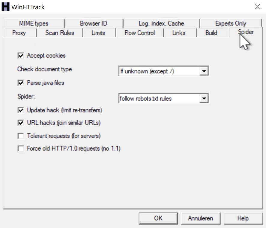 Op de tab Spider kijk je even naar het selectiemenu achter Spider:. Laat je daar de standaardselectie follow robot.txt rules staan, dan is de kans groot dat de site of grote delen daarvan niet binnengehaald worden. Minder netjes (maar wel gegarandeerd werkend) is de optie no robots.txt rules. Maar goed: als je een site maar één keertje download …