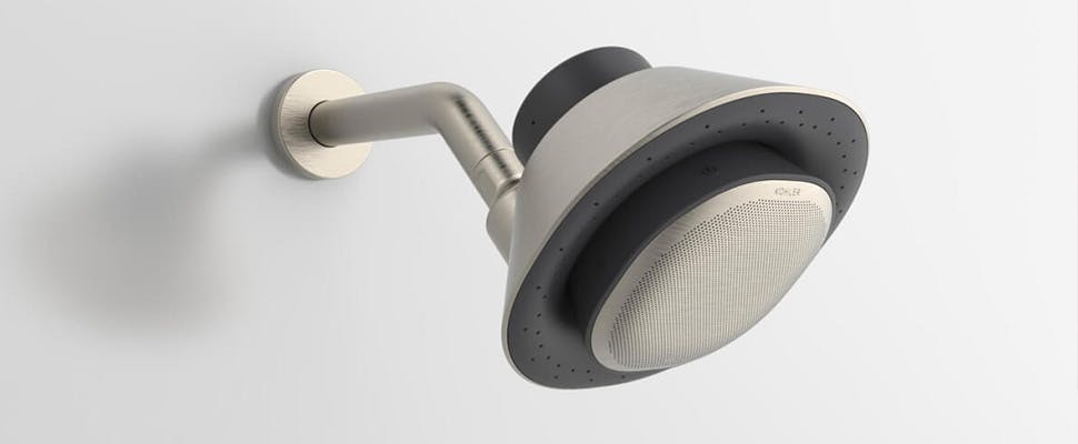 Het speakergedeelte wordt magnetisch vastgezet in het midden van de douchekop, die de naam Moxie draagt. Daar omheen zit de ring waar het water uitkomt. Uiteraard is de speaker voor dit doeleinde waterdicht gemaakt. Voor het geluid sloeg Kohler de handen ineen met audio-expert Harman Kardon. Muziek is afkomstig van een gekoppeld bluetooth-apparaat, zoals je smartphone.