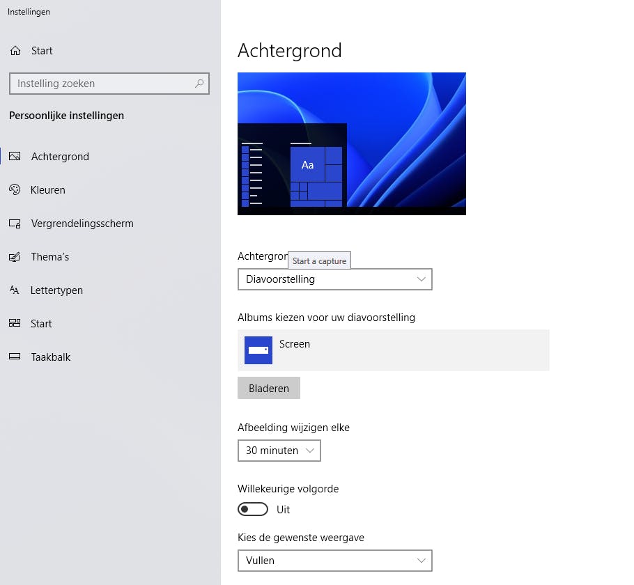 Ook geef je aan hoe vaak de afbeelding moet wijzigen. Standaard staat dit op 30 minuten. Op een desktop is dit geen probleem, maar weet dat deze optie er op een laptop voor zorgt dat je batterij iets sneller leegloopt.
