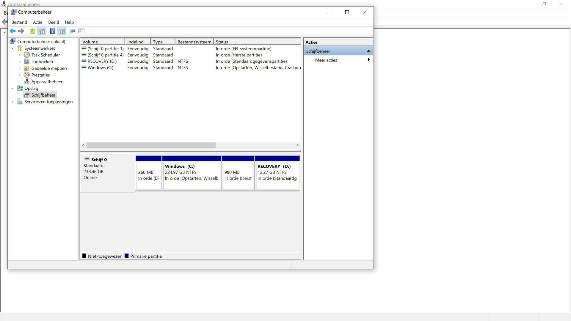 Je kunt ook kijken of je het probleem kunt oplossen via Computerbeheer. Open het startmenu en zoek op de woorden Computerbeheer. Open de app en ga links in het menu naar Schijfbeheer (onder het kopje Opslag). Na het aanklikken van je harde schijf kan het zijn dat er wordt gemeld dat die schijf online is. Klik met je rechtermuisknop op die schijf en selecteer vervolgens de optie Online.