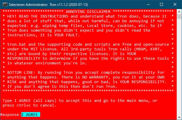 Wie hoopt Tron vanaf een live-cd of vanuit een WinPE-omgeving op te starten, moeten we teleurstellen: Tron werkt met diverse systeemvariabelen die niet beschikbaar zijn in zo’n omgeving. En let op, Tron laat je eerst een rood venster zien waarin je letterlijk de tekst I AGREE moet intikken voor Tron verder wil gaan.