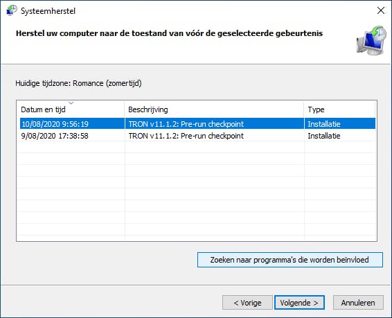 Tijdens deze fase analyseert Tron je Windows-omgeving en neemt die enkele voorzorgsmaatregelen, zoals een registerback-up en een systeemherstelpunt. Dit laatste kun je desnoods terugzetten door op Windows-toets+R te drukken en rstrui.exe uit te voeren, waarna je de verdere instructies volgt.