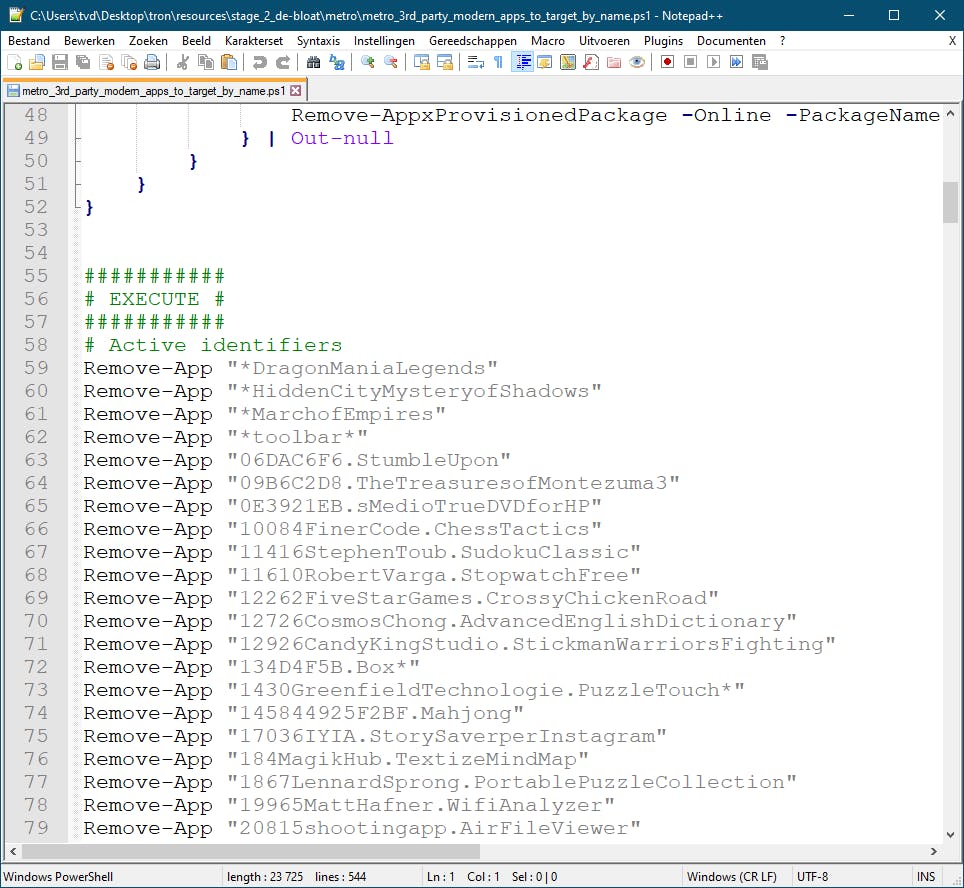 Er worden standaard ook heel wat Microsoft Store-apps verwijderd. Nu kun je die desnoods nog wel terugzetten vanuit de Microsoft Store, maar je kunt ook vooraf zelf bepalen welke je wilt behouden, door die in de submap \metro uit de twee PowerShell-scripts weg te halen. Met de parameter -m (Metro apps) worden er geen Microsoft Store-apps verwijderd. Wil je fase 2 helemaal overslaan, dan gebruik je de parameter -sdb (Skip De-Bloat).