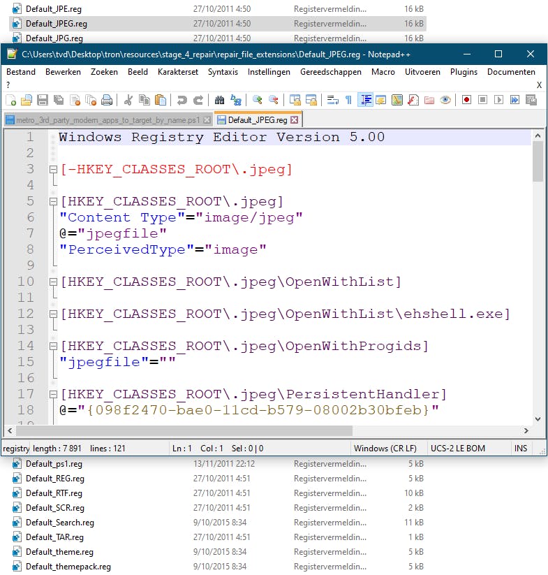 Standaard koppelt Tron ook heel wat bestandsextensies weer aan de originele programma’s. Om dat te vermijden, moet je het reg-bestand dat naar zo’n extensie verwijst (bijvoorbeeld Default_JPG.reg en Default_JPEG.reg) verwijderen uit de map \tron\resources\stage_4_repair\repair_file_extensions.