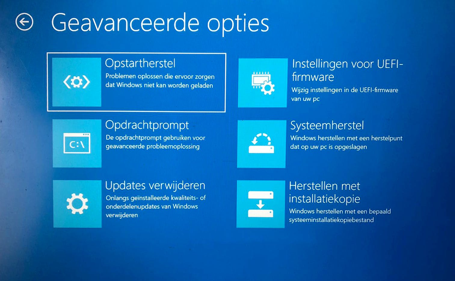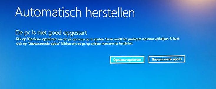Je kunt deze situatie zelf forceren door je computer op te starten en zodra je het Windows-logo ziet, onmiddellijk de start-stopknop 15 seconden in te drukken zodat de machine afsluit. Herhaal deze brute manier van starten en stoppen twee of drie keer. Daarna duikt de melding op: Automatisch herstel voorbereiden en ben je in WinRE om met de Geavanceerde opties de opdracht Opstartherstel te starten.