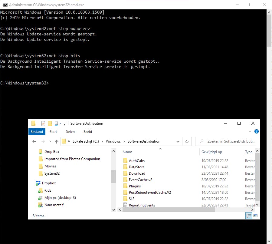 Open de opdrachtprompt als admin en voer de opdracht net stop wuauserv uit. Hiermee stop je de Windows-updateservice. Vervolg het commando net stop bits. Navigeer met Verkenner naar de map C:\Windows\SoftwareDistribution.