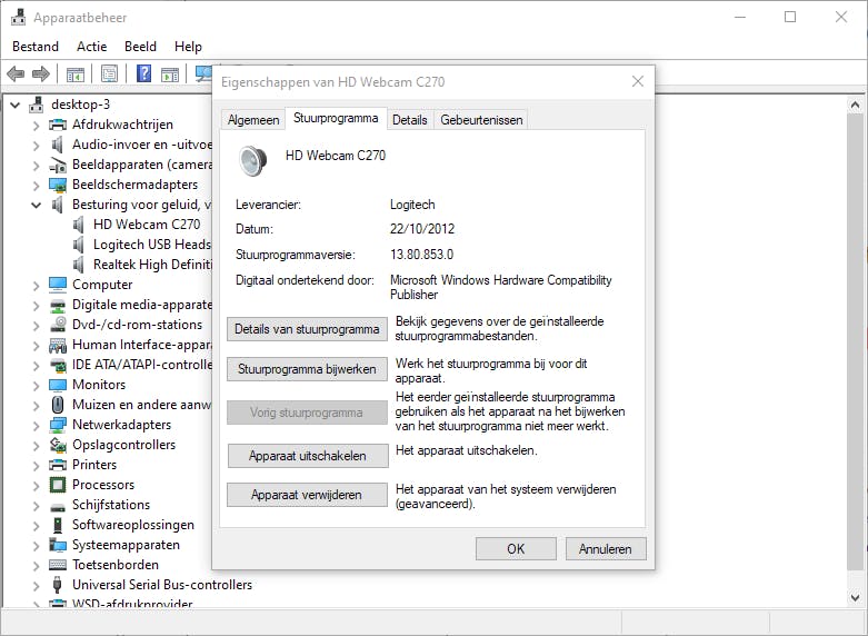 Klik met de rechtermuisknop de verdachte driver op en selecteer Eigenschappen. In het tabblad Stuurprogramma klik je op de knop Vorig stuurprogramma. Als dat niet lukt, klik je met de rechtermuisknop op de naam van het apparaat en selecteer je Apparaat uitschakelen. Kies Stuurprogramma verwijderen en start de computer opnieuw op.