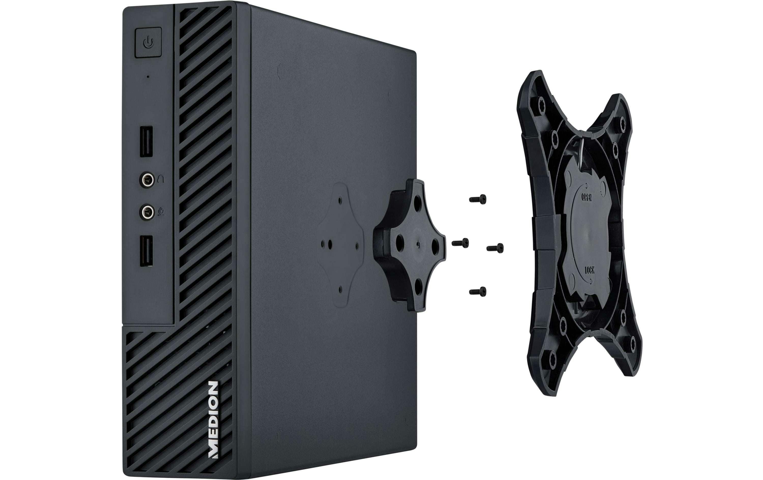 Ondanks zijn lage prijskaartje van 329 euro kun je de Akoya S23002 volgens Medion moeiteloos naar Windows 11 upgraden. Deze desktop bezit een aantal interessante eigenschappen. Allereerst meet de zwarte behuizing slechts 21,1 × 19,8 × 5,4 centimeter. Vanwege het kleine formaat kun je de systeemkast gemakkelijk volledig uit het zicht plaatsen, zo bevat de zijkant speciale bevestigingspunten om de behuizing achter op een monitor te bevestigen. Hiervoor kun je de bijgesloten vesa-montagebeugel gebruiken.
