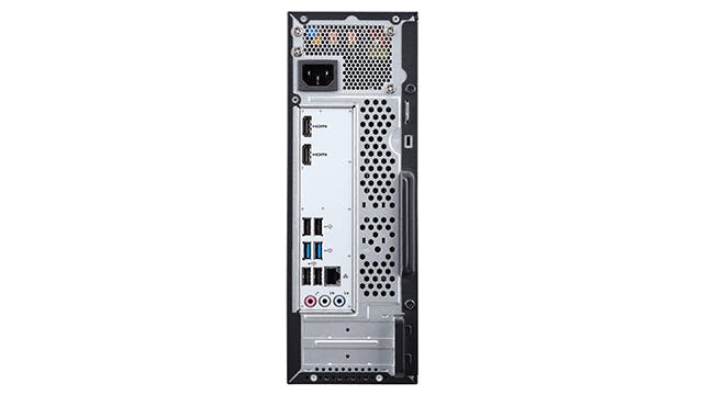 Windows 10 Home is op een ssd van 256 GB voorgeïnstalleerd. Je krijgt via Windows Update een upgrade naar Windows 11 aangeboden. Via de voorzijde heb je toegang tot vier usb-poorten en een SD-kaartlezer. De achterzijde bevat onder meer een HDMI-uitgang, gigabitpoort en nog eens vier usb-aansluitingen. Jammer genoeg ontbreekt er wifi-ondersteuning, waardoor je genoodzaakt bent om een internetkabel in de behuizing te prikken.