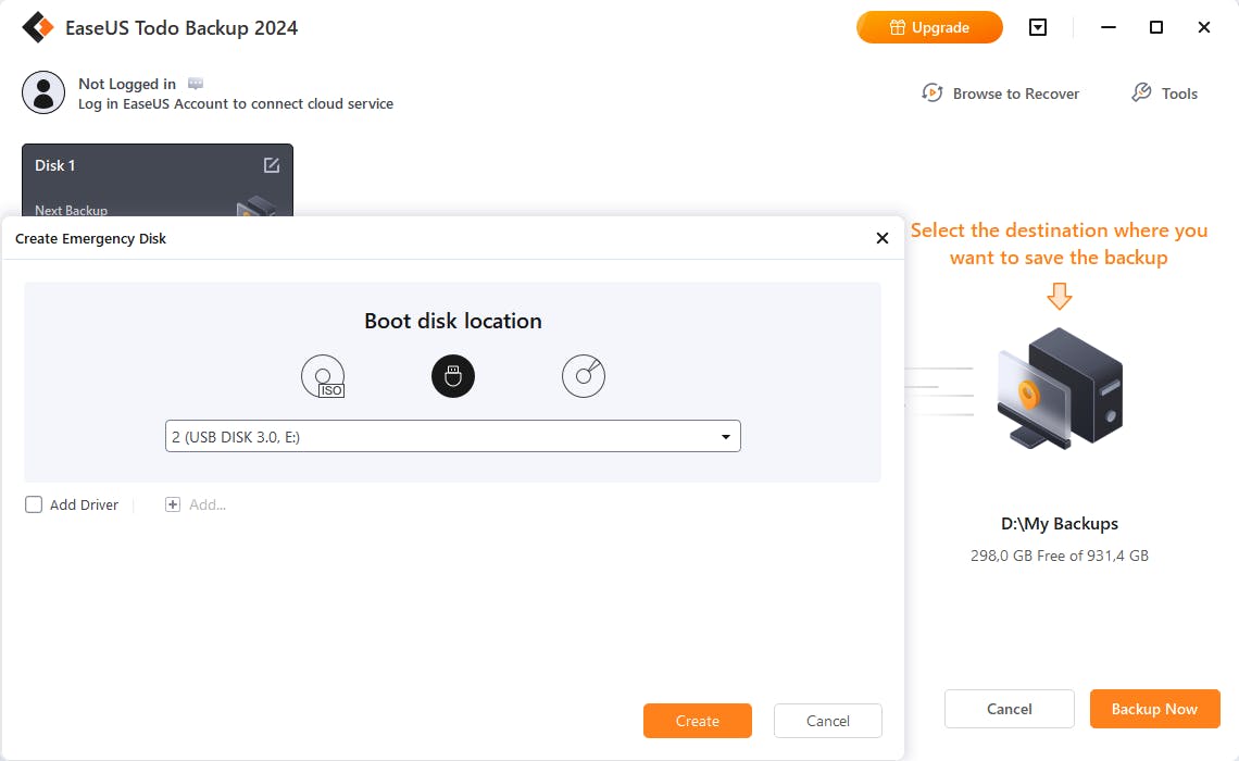 Om zo’n gemaakte back-up in te zien of daadwerkelijk te herstellen zelfs als je systeem niet meer zou opstarten, maak je een herstelmedium op een usb-stick. Hiervoor druk je rechtsboven in EaseUS Todo Backup op de optie Tools en kies je Create Emergency Disk. Overigens is de optie Enable PreOS in principe ook een optie, maar bij een dualboot-configuratie raden we dit af. Stop een (lege) usb-stick in je pc en klik op het stickicoontje bij Boot Disk Location. Bevestig met Create. Voor alle zekerheid start je na afloop je systeem van deze usb-stick op om te controleren of de gemaakte back-up echt bereikbaar is. Mocht er naderhand iets misgaan, dan kun je de situatie wellicht nog herstellen via systeemherstel of desnoods met je herstelmedium.