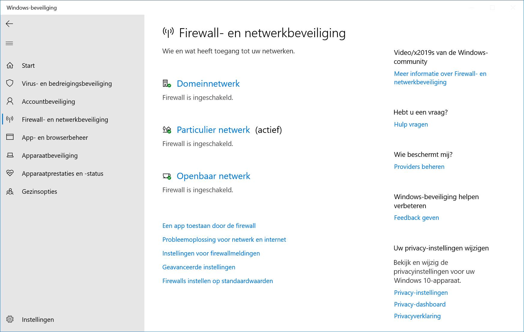 In het hoofdvenster vind je de status van de firewall: ook hier wordt onderscheid gemaakt tussen de verschillende netwerktypen, zoals privéprofiel en openbaar profiel.
