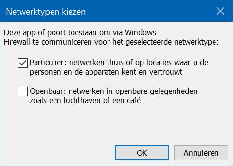 Vervolgens klik je op Netwerktypen. In dit venster bepaal je binnen welk netwerk de app mag communiceren. Kies tussen Particulier of Openbaar en bevestig met een klik op OK. Controleer de instellingen en klik op Toevoegen om de nieuwe app te bewaren.