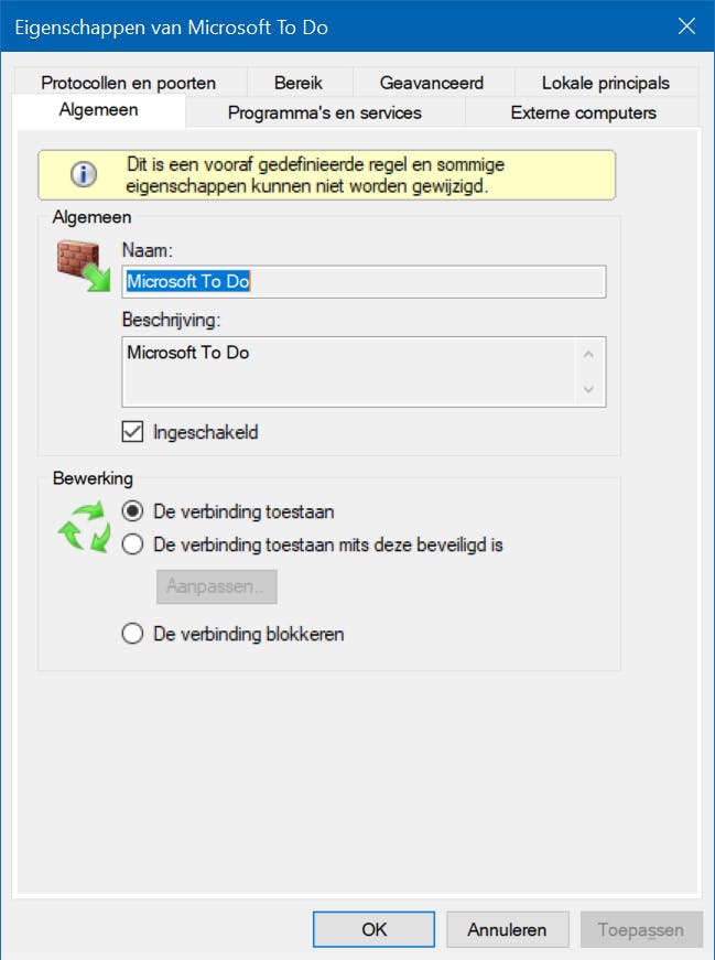 Op een later moment herstel je de bewerking weer door hetzelfde tabblad te openen en te kiezen voor De verbinding toestaan. Het is belangrijk dat je elke aanpassing in de firewall vastlegt, bijvoorbeeld in een Word-document. Zo kun je een situatie altijd relatief eenvoudig terugdraaien.