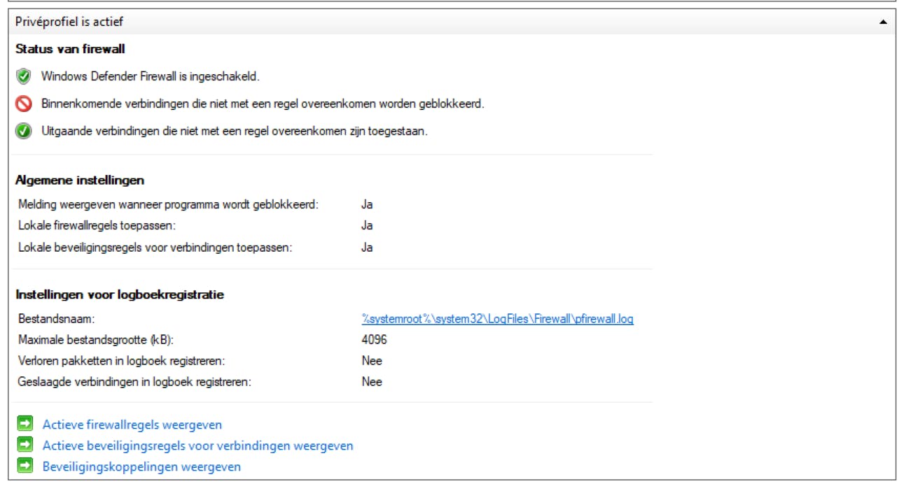 Klik op Eigenschappen van Windows Defender Firewall om het eigenschappenvenster te openen. Dit is onder meer opgebouwd uit de eerdergenoemde netwerkprofielen. Klik bijvoorbeeld op het tabblad Privéprofiel. Bij Status lees je of de firewall actief is.