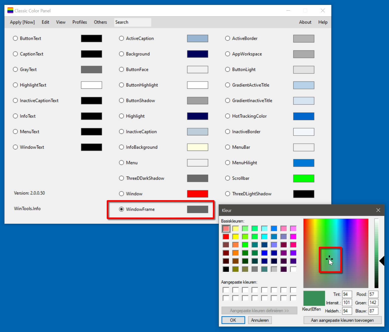 Als Classic Color Panel is doorgestart, wordt direct duidelijk hoe de vork in de steel zit. Je kunt een voor een alle kleuritems van Windows 10 aanpassen. Van de schermachtergrond tot en met de menubalk, het kan en mag allemaal een eigen kleurtje krijgen. Hoe je dat doet, wijst vanzelf. Je krijgt de mogelijkheid om snel gebruik te kunnen maken van kleurprofielen, die je ook nog eens zelf kunt beheren. Kortom, je kunt het weer zo ouderwets kakelbont maken als je zelf wilt.