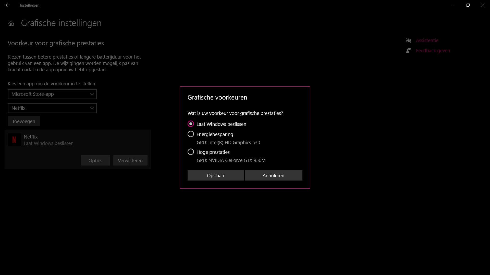 Tot slot kijken we nog even naar het gebruik van drivers voor graphics. Mogelijk kun je een andere driver uitkiezen, die minder energie verbruikt. De graphics in je videogames zien er dan ook minder goed uit, dus wellicht is het dan wederom geen optie voor je. Maar voor simpel, dagelijks gebruik kan dit wederom voor wat energiebesparing zorgen. Je gaat hiervoor naar Instellingen > Systeem > Beeldscherm > Grafische instellingen (staat helemaal onderaan).