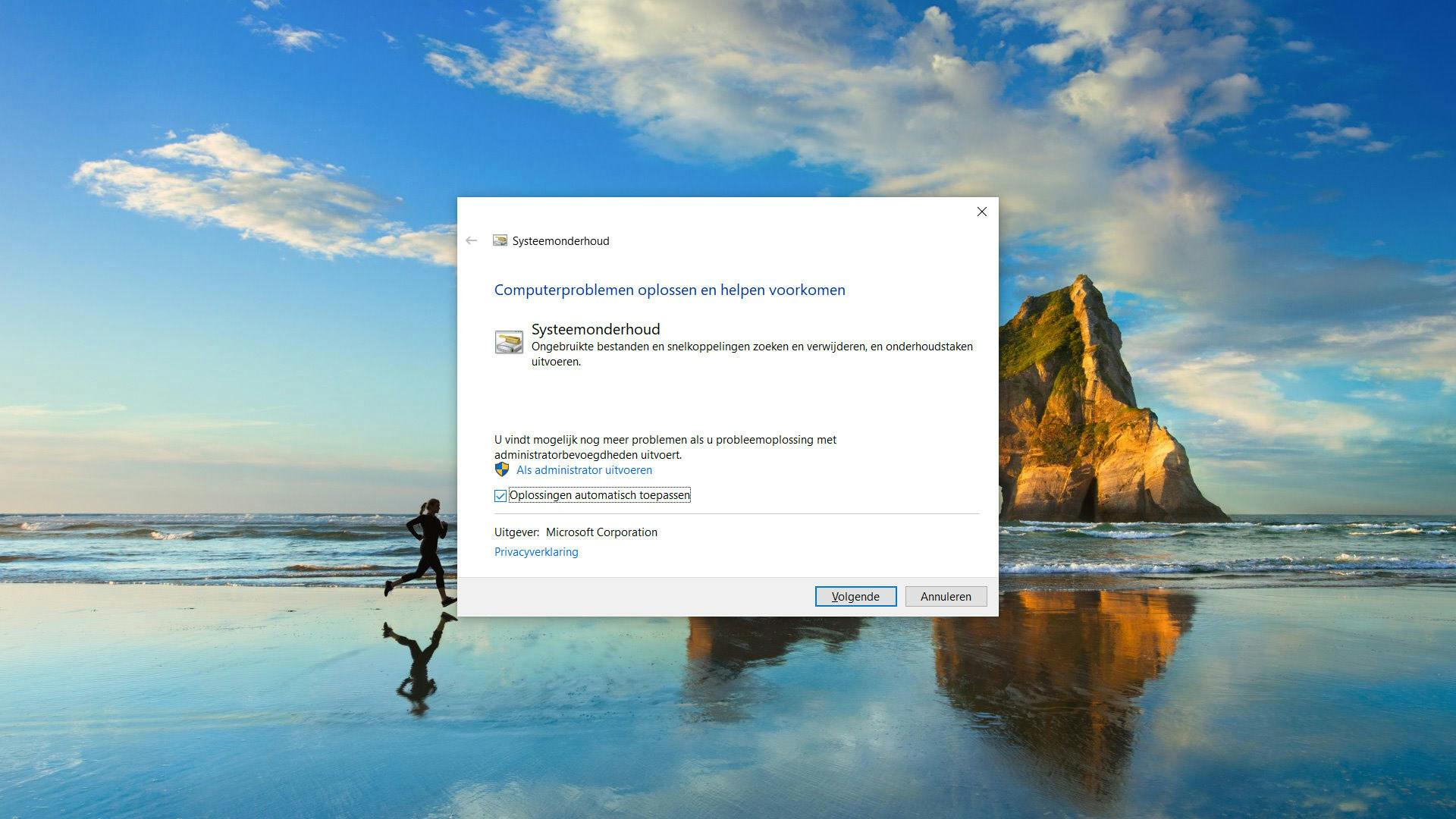Het kan daarnaast helpen een probleemoplosser erop los te laten. Druk op de Windows-toets + R om het Uitvoeren-venster naar boven te halen. Kopieer de volgende tekst in het veld en druk op Enter: msdt.exe -id MaintenanceDiagnostic. Daarmee open je Systeemonderhoud.
