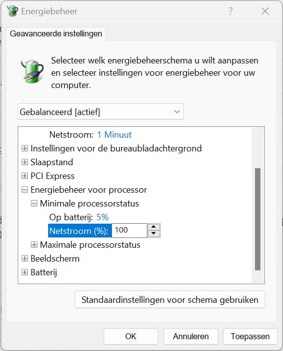In het instellingenvenster van Windows kies je voor Systeem, Aan/uit en accu. Bij de optie Energiemodus kies je voor Beste prestaties. Bovendien kun je afdwingen dat de processor altijd volledig wordt benut. Open Startmenu en typ Energie. Kies Energiebeheerschema bewerken. Klik hierna op Geavanceerde energie-instellingen wijzigen. Klap de sectie Energiebeheer voor processor uit. Bij zowel Minimale processorstatus als Maximale processorstatus kies je bij de modus Aangesloten voor 100%.