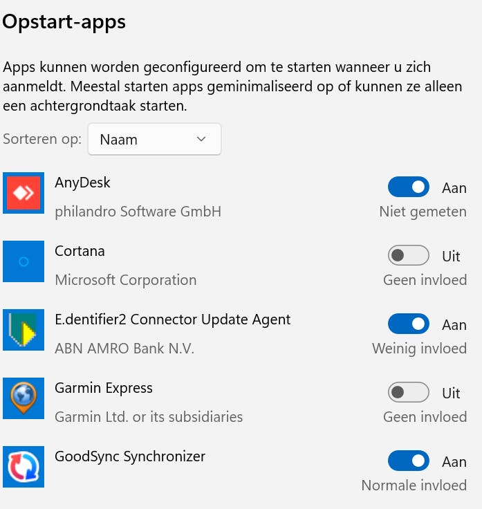 Bij elke app lees je hoeveel beslag de app legt op het systeem, bijvoorbeeld Veel invloed of Weinig invloed. Die informatie helpt bij het beoordelen of de app de moeite waard is. Via de sorteerfunctie bovenin kun je de apps sorteren op impact (kies bij Sorteren op voor Invloed op opstarten). Zet de schuif op Uit bij apps die je niet meer wilt opstarten.