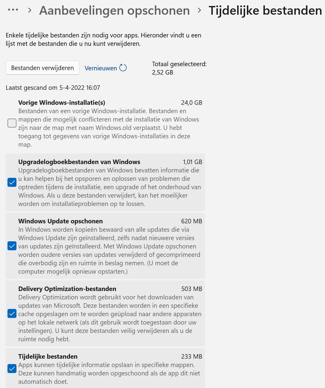 Onder Tijdelijke bestanden wordt een aantal suggesties gedaan, maar Windows laat niet zien wat er écht kan worden opgeschoond. Klik daarom op Geavanceerde opties weergeven. Hier zie je een volledig overzicht van te verwijderen bestanden.
