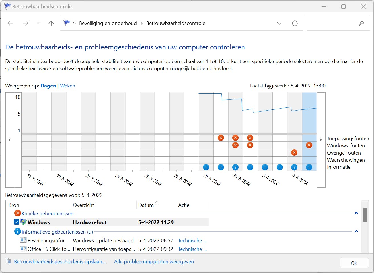 Het verhogen van de Windows-prestaties gaat natuurlijk hand in hand met de stabiliteit van de computer. Een handig hulpmiddel hiervoor is Betrouwbaarheidscontrole. In zowel Windows 10 als Windows 11 heb je dit onderdeel tot je beschikking. Open Startmenu en typ Betrouwbaarheid. Kies Betrouwbaarheidsgeschiedenis weergeven. Je ziet in een grafiek hoe de betrouwbaarheid van de computer zich heeft ontwikkeld. Per dag lees je welke gebeurtenissen hebben plaatsgevonden.