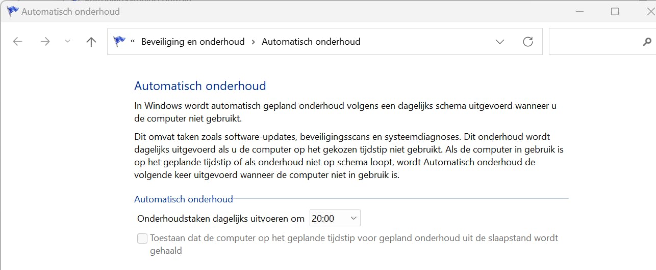 Open Startmenu en typ Automatisch onderhoud. Kies voor Instellingen voor automatisch onderhoud wijzigen. Bij Onderhoudstaken dagelijks uitvoeren om kies je de gewenste tijd. Klik op OK.