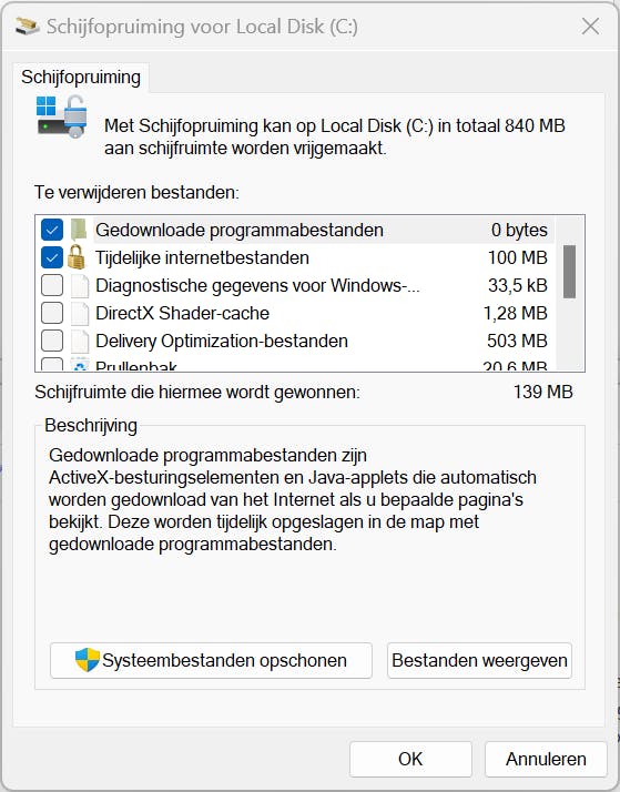 Open Startmenu en typ Schijfopruiming. Nadat de controle is uitgevoerd, klik je op de knop Systeembestanden opschonen. Schijfopruiming wordt nu nogmaals uitgevoerd, maar toont nu meer onderdelen die je kunt opschonen.