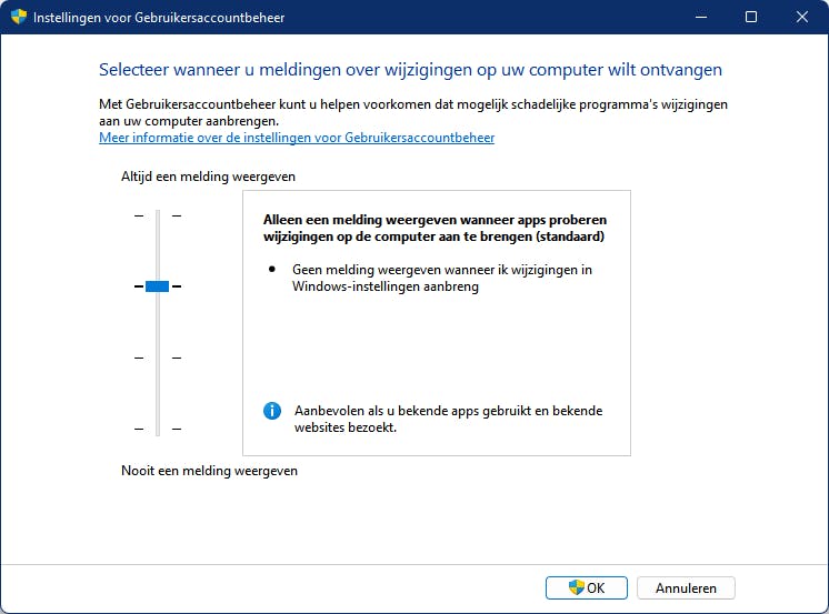 Open Configuratiescherm in het startmenu en kies Gebruikersaccounts (2x) / Instellingen voor Gebruikersaccountbeheer wijzigen. Standaard staat de beveiliging op het tweede hoogste niveau, maar eventueel stel je deze in op het hoogste niveau.