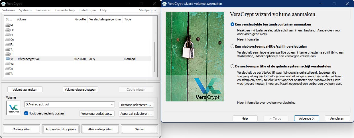 Kies voor een Standaard VeraCrypt-volume en verwijs naar een nog niet bestaand bestand. Stel de gewenste volumegrootte in en vul een wachtwoord in (2x). Klik op Formatteren. Terug in het hoofdvenster klik je op Bestand selecteren en verwijs je naar het volumebestand. Selecteer een vrije stationsletter en klik op Koppelen. Zodra je het wachtwoord hebt ingevuld, is je versleutelde station gebruiksklaar.