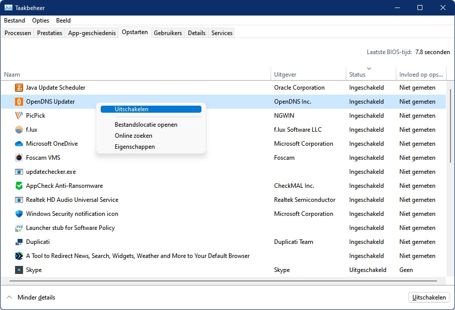 Het gratis Iobit Uninstaller laat je niet alleen toe meerdere toepassingen tegelijk te de-installeren, de verwijdering gebeurt vaak ook grondiger dan vanuit Windows. Start tevens het ingebouwde taakbeheer op via Ctrl+Shift+Esc, open het tabblad Opstarten, rechtsklik op apps die je liever niet automatisch mee laat opstarten en kies Uitschakelen.