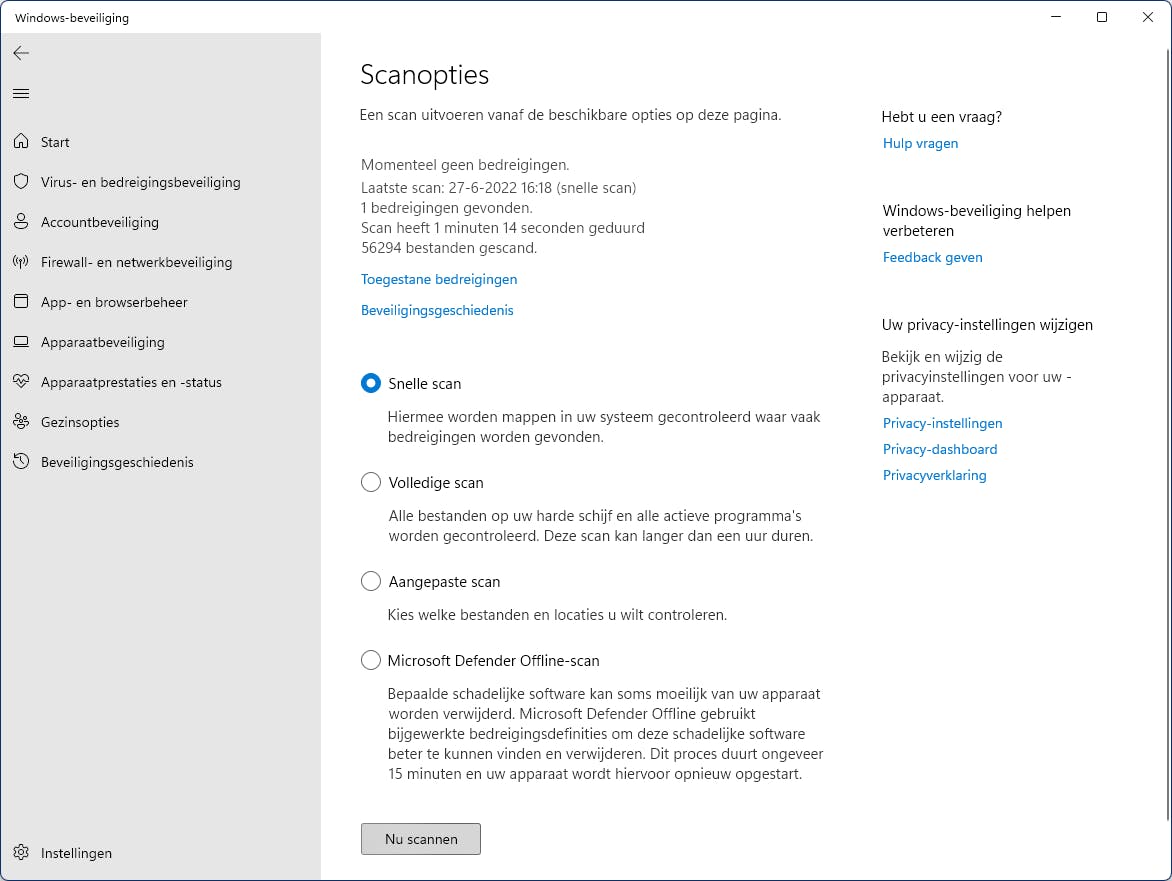 Open opnieuw Windows-beveiliging / Virus- en bedreigingsbeveiliging, klik op Scanopties, selecteer Microsoft Defender Offline-scan en bevestig met Nu scannen. Je systeem wordt hiervoor opnieuw gestart.