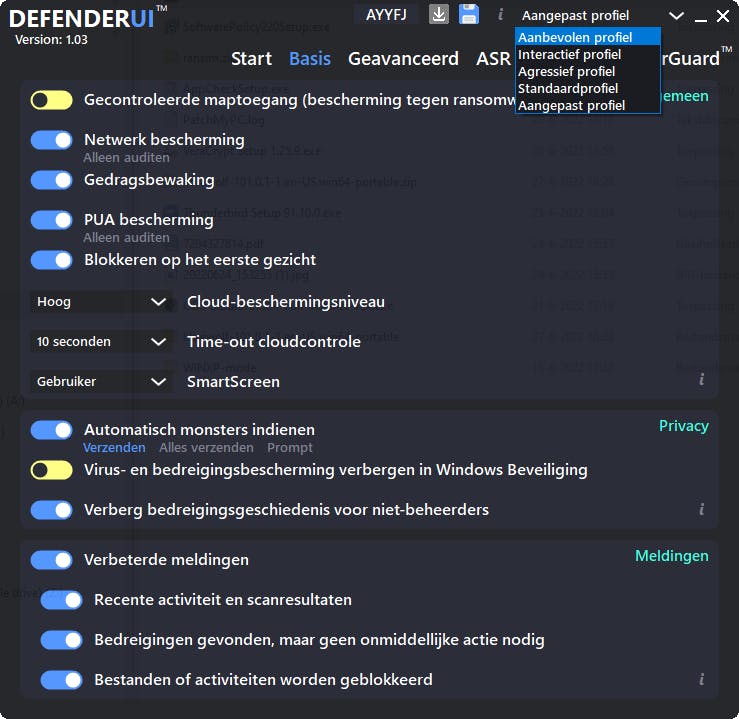Je kunt de opties ook zelf nog aanpassen op de tabbladen Basis, Geavanceerd, ASR Regels en DefenderGuard. Kies vervolgens Aangepast profiel en bewaar je voorkeuren via het diskette-icoon. Lees hier meer over DefenderUI.