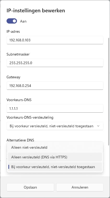 Ga naar Instellingen / Netwerk en internet. Kies Ethernet of Wi-Fi, gevolgd door Hardware-eigenschappen en klik op Bewerken bij DNS-server toewijzing wanneer die op Automatisch (DHCP) staat ingesteld, zodat je die Handmatig kunt instellen.