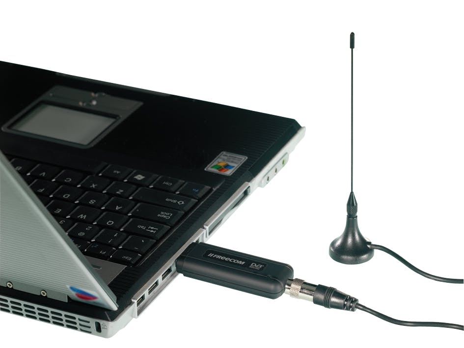 Kijk, en dat rechtvaardigt misschien de aanschaf van een tv-receiver voor uw laptop - want dan kunt u ook onderweg elke wedstrijd bekijken. Freecom komt met de DVB-T USB Stick, een ieniemienie-dingetje van 28 x 15 x 86 mm en 25 gram. Bovendien kan het stickje, in combinatie met de harde schijf, ook functioneren als een volwaardige digitale videorecorder, inclusief Electronic Programme Guide en teletekst. Kost dat nou? 79 euro. Lijkt misschien wat veel voor één zender, maar: vanaf 30 oktober aanstaande kunnen ook Nederland 1 en Nederland 3 door zo'n ontvangertje opgepikt worden.