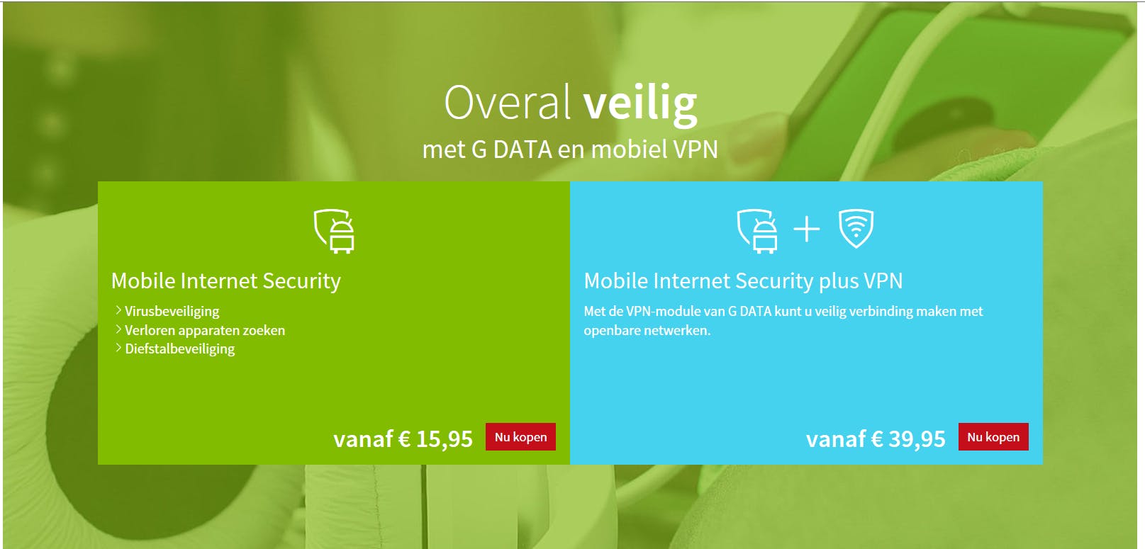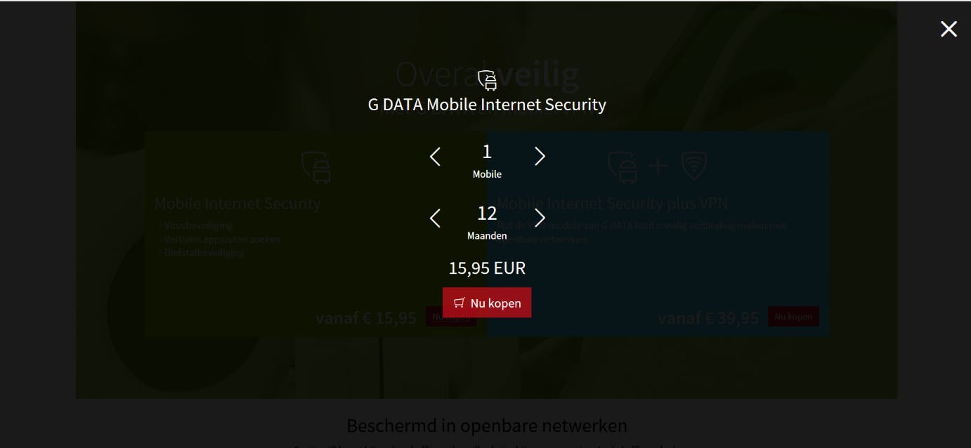 Op de website van G DATA kunt u kiezen welke versie u wilt aanschaffen: G DATA Mobile Internet Security voor Android of G DATA Mobile Internet Security plus VPN voor Android. Indien u kiest voor de versie zonder VPN, kunt u deze module achteraf alsnog in de app zelf aanschaffen. De tarieven voor VPN zijn €2,99 per maand of €29,99 voor een jaar.