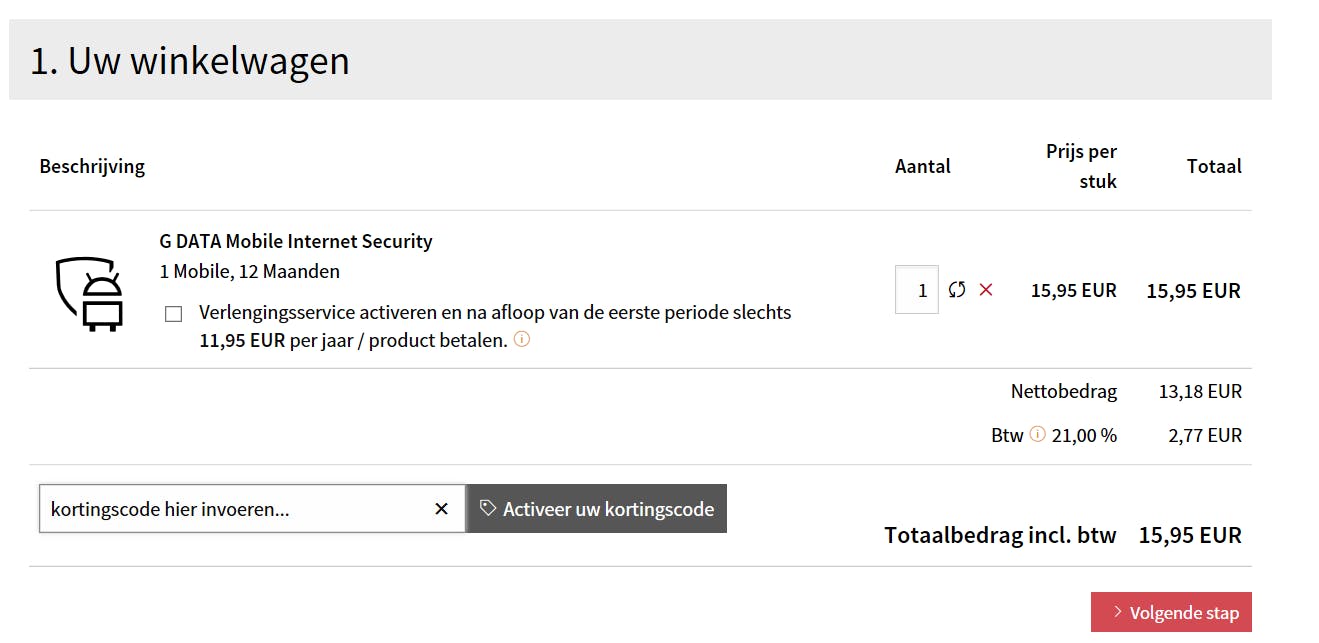 Na het selecteren van uw keuze, klikt u op ‘Nu kopen’. U komt nu in het scherm van het winkelwagentje terecht. Hier kunt u links onderaan uw unieke kortingscode invoeren, die u een korting van 30% geeft.