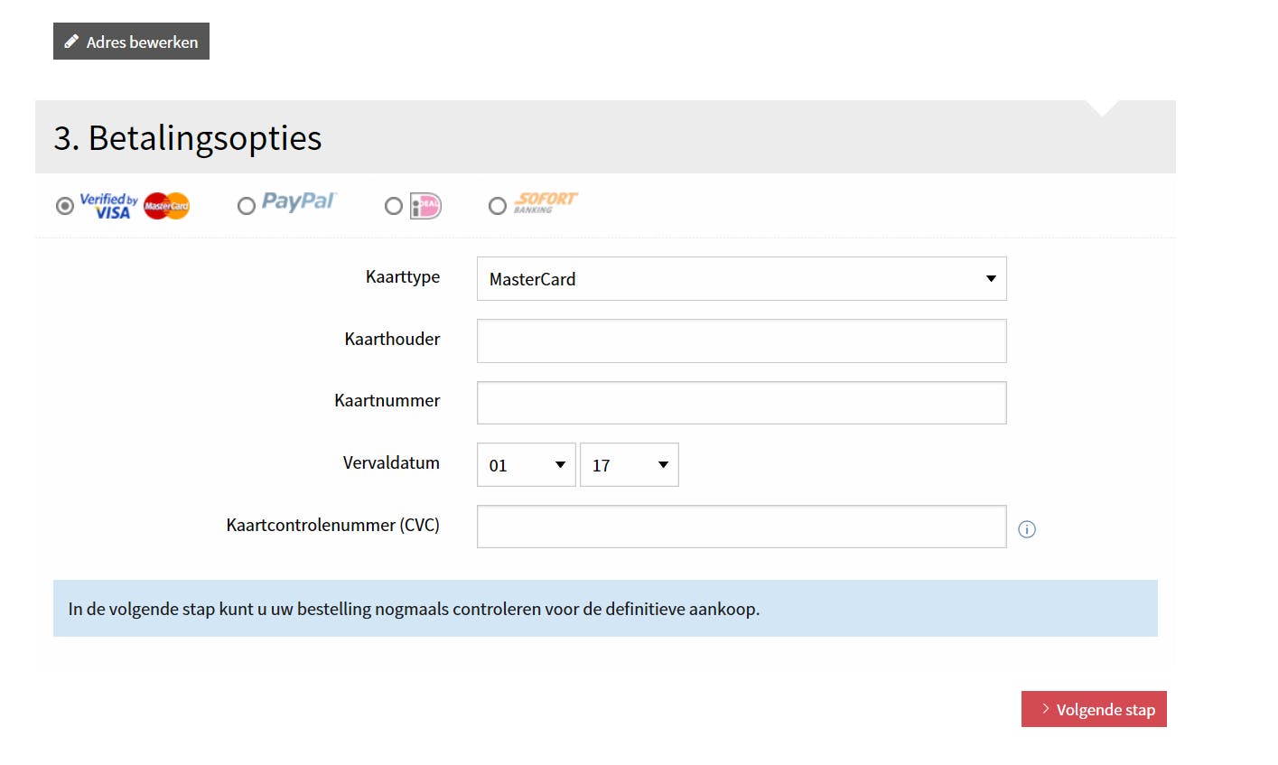 Bij de laatste stap kunt u kiezen via welke weg u wilt betalen: Creditcard, Paypal, IDEAL of Sofort.