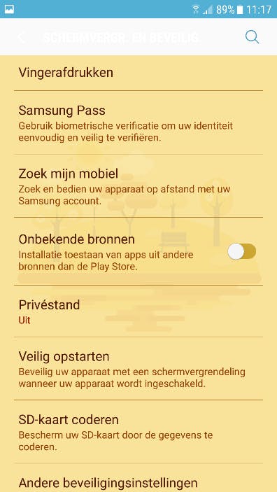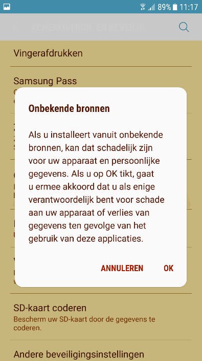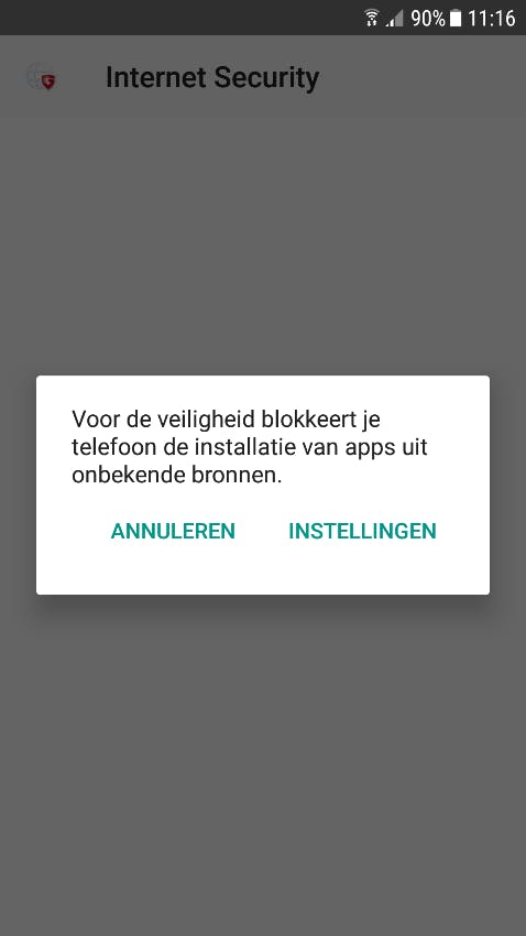 i. U kunt via de instellingen van uw telefoon (Beveiliging of Schermvergrendeling en beveiliging) het downloaden van apps vanuit onbekende bronnen tijdelijk toestaan.