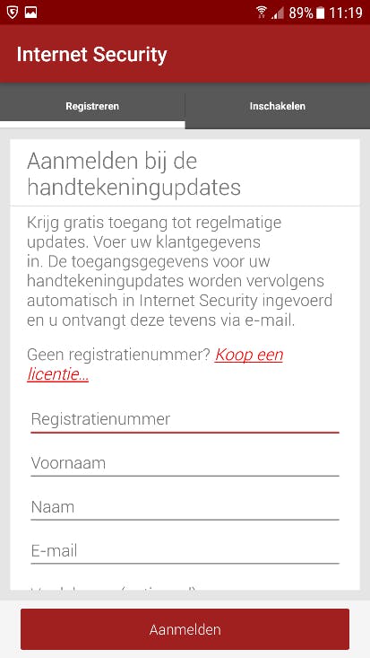 In het veld daaronder worden enkele gegevens gevraagd zoals uw naam, adres en e-mailadres. Deze zijn nodig om uw gebruikersgegevens naar u te kunnen sturen. Ook wordt u per e-mail op de hoogte gesteld als uw licentie afloopt en ontvangt u een verlengingsaanbod en/of een factuur.
