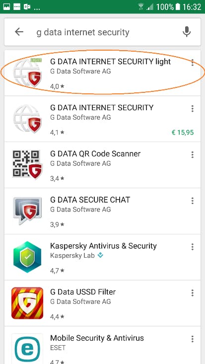 ii. U kunt het .apk-bestand opzoeken in de Google Play Store en het bestand van daar downloaden. Let er goed op dat u kiest voor de Lightˈ versie (G DATA INTERNET SECURITY light), die u door invoering van uw registratiecode na 30 dagen uitbreidt naar de versie die u heeft aangeschaft. Als u in de Play Store voor de betaalde versie kiest, moet u namelijk opnieuw betalen, wat uiteraard niet nodig is. Voor de verdere installatie, ga naar stap 7.
