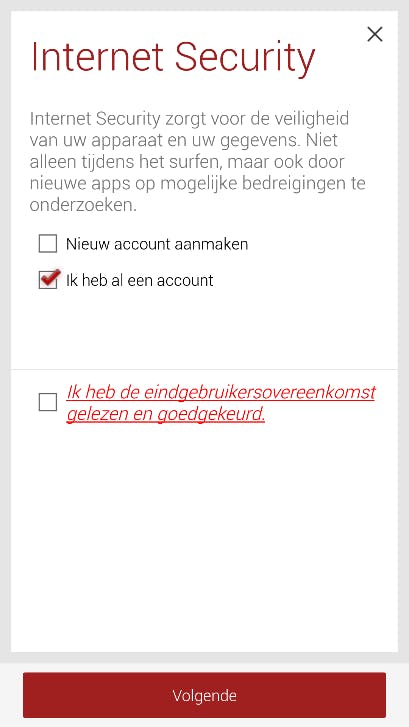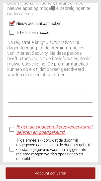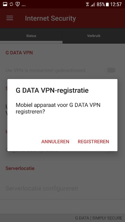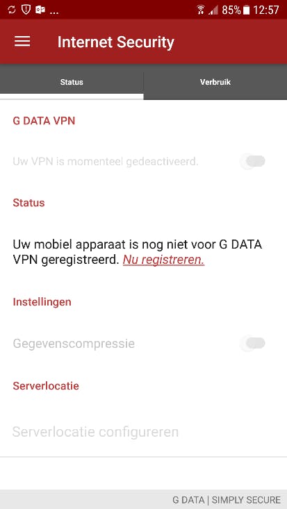 U komt in een menu waarin u uw abonnement kunt registreren. 1) Klik op het linkje ‘Nu registreren’. 2) Bevestig uw keuze door op ‘Registreren’ te klikken. 3) Geef de app de benodigde toestemming. 4) Nu is uw G DATA Mobile Internet Security plus VPN-abonnement actief.