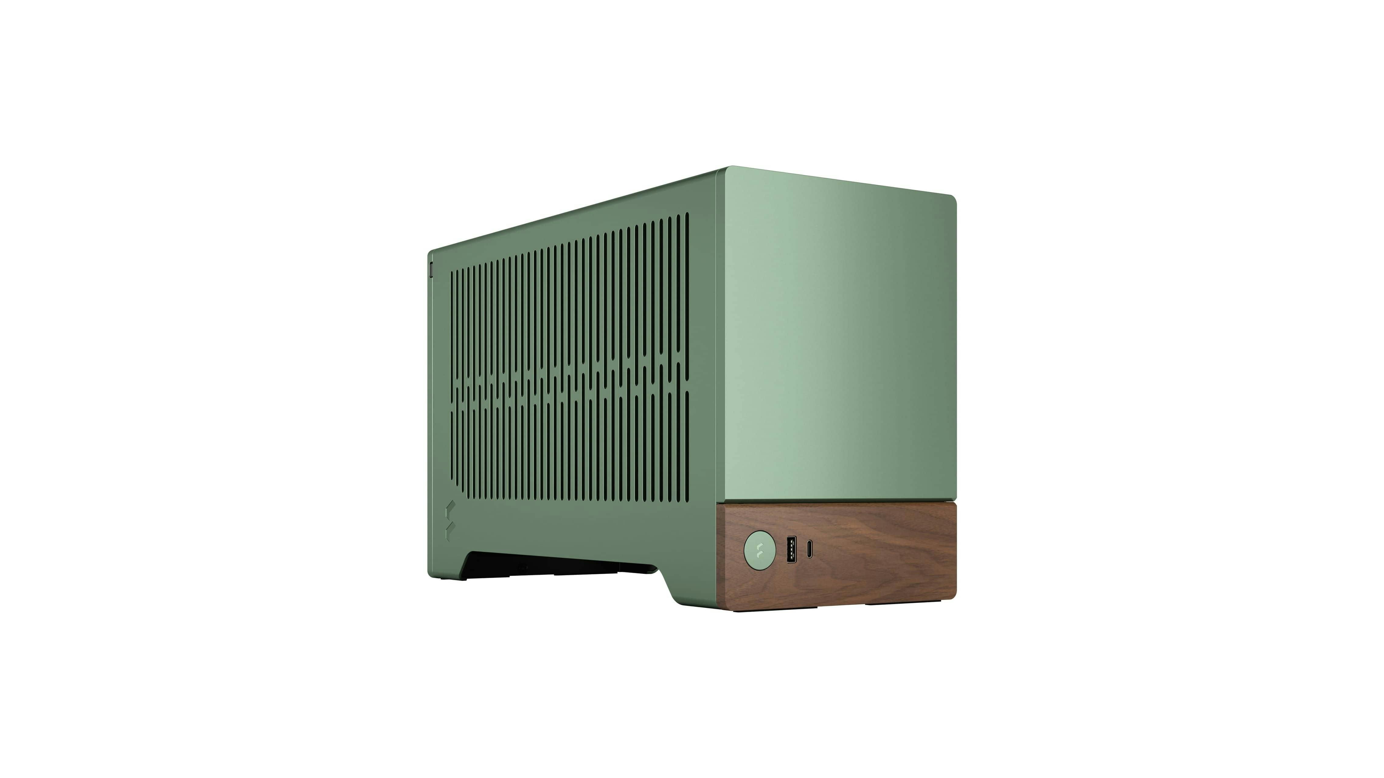 Ook wie liever een compact systeem heeft, kan terecht bij Fractal Design. De fraai vormgegeven Terra is leverbaar in drie kleuren, waaronder groen, en is voorzien van een houten accent gemaakt van walnoothout waarin onder meer een usb-c-poort is aangebracht. De rest van de behuizing is gemaakt van stevig aluminium. De Terra is een compacte itx-behuizing en voor het monteren van de grafische kaart heb je dan ook een meegeleverde PCIe4.0-riser cable nodig.