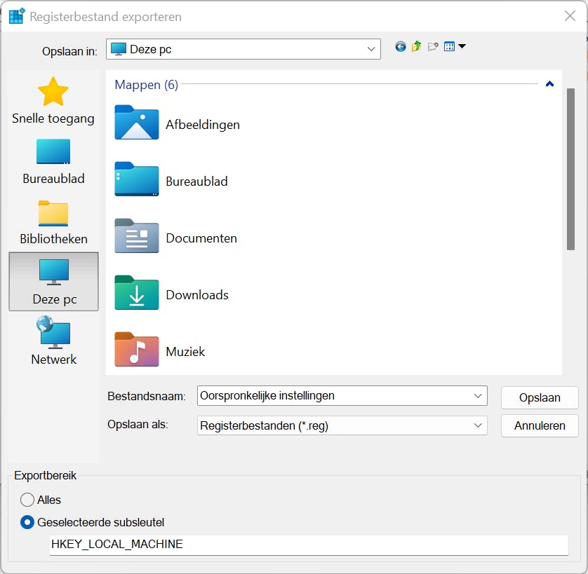 Om het risico zoveel mogelijk te verkleinen, kun je de registerinstelling die je wilt aanpassen eerst exporteren. Voer hierna de aanpassing door. Ben je niet tevreden en wil je terug naar de oorspronkelijke situatie? Importeer dan simpelweg de oorspronkelijke instelling. In de paragraaf ‘Import en export’ van dit artikel leggen we uit hoe dat werkt.