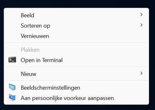 Als je in Windows 11 met de rechtermuisknop op het bureaublad klikt, verschijnt een relatief compact contextmenu. Het vertrouwde contextmenu uit Windows 10 – waarin alle opties in één keer worden gepresenteerd – verschijnt pas als je klikt op Meer opties weergeven.